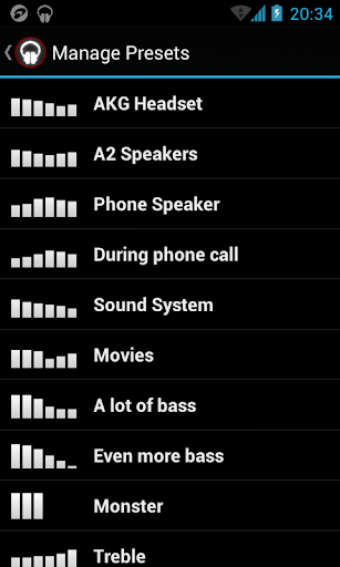 20 Presets (More Basses, Improve quality, Electro, Techno, Dubstep, Dance, Pop, Rock, Metal, Reggae, Rap, R&B, Hip-Hop, Jazz, Latino, Acoustic, Classical, Party, Voice Boost, Volume Boost)
